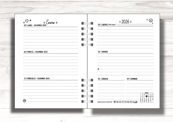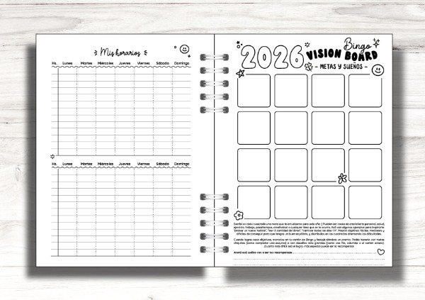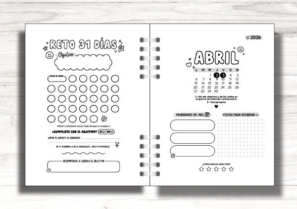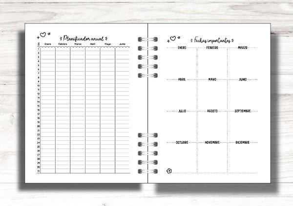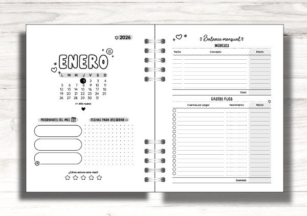 Por cada mes: planner mensual con tracker de hábitos, balance mensual (para anotar ingresos y gastos) y planner semanal con los días.